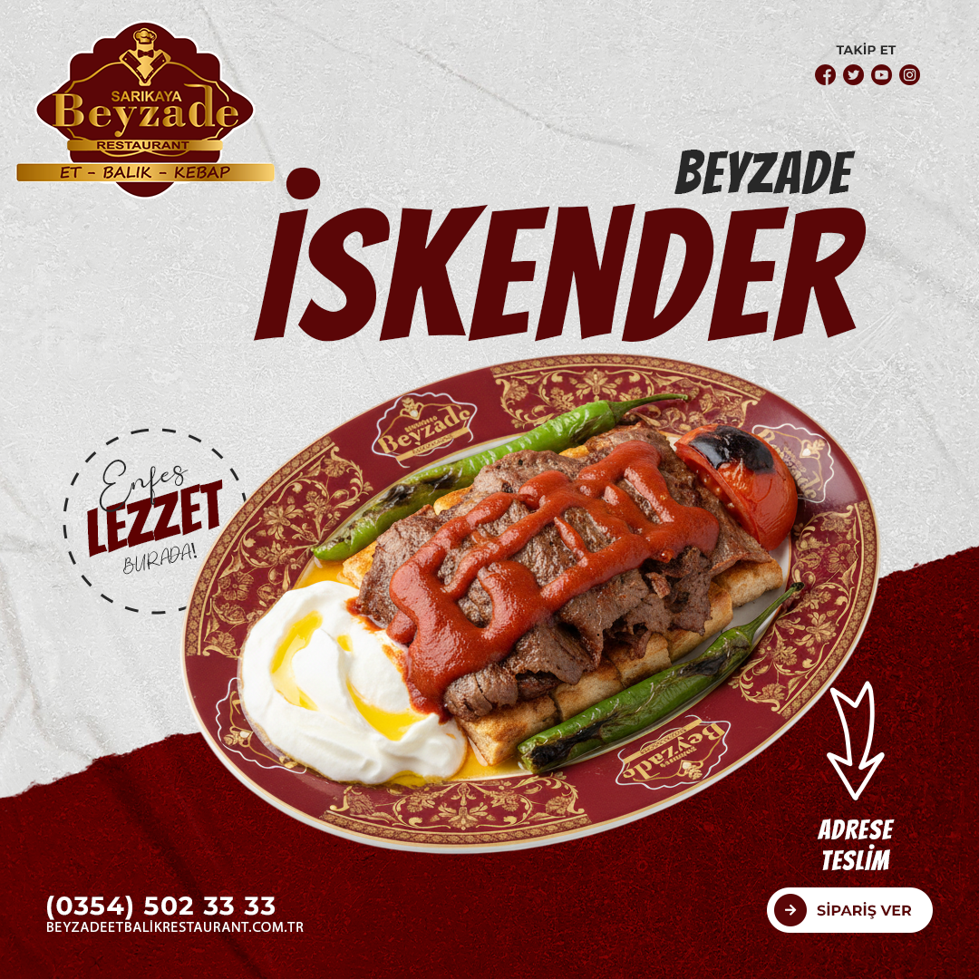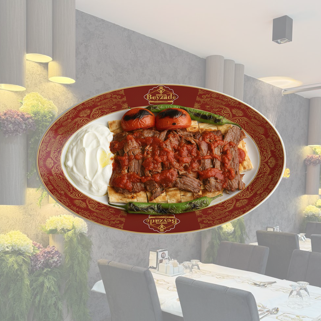 Beyzade’de, İskender Kebap sadece bir yemek değil, tam anlamıyla bir lezzet deneyimidir. Her lokma, tarih kokan bir tat ve özenle pişirilmiş etin doyuruculuğunu sunar. Taze pide, tereyağı, yoğurt ve dönerin birleşimiyle damağınızda unutulmaz bir tat bırakır.